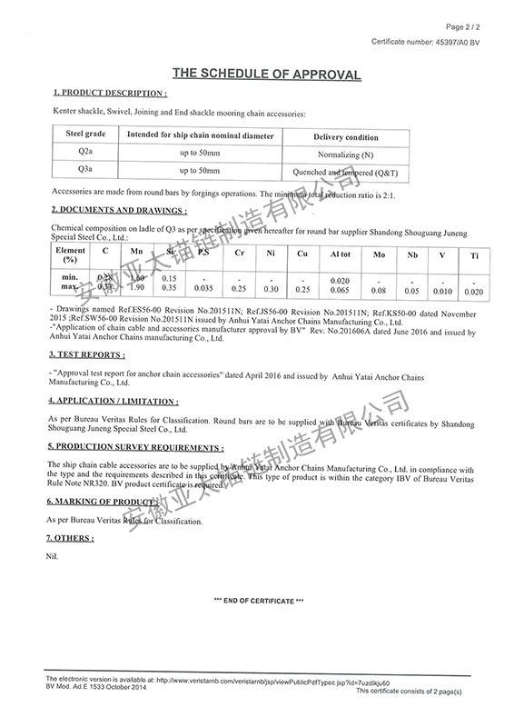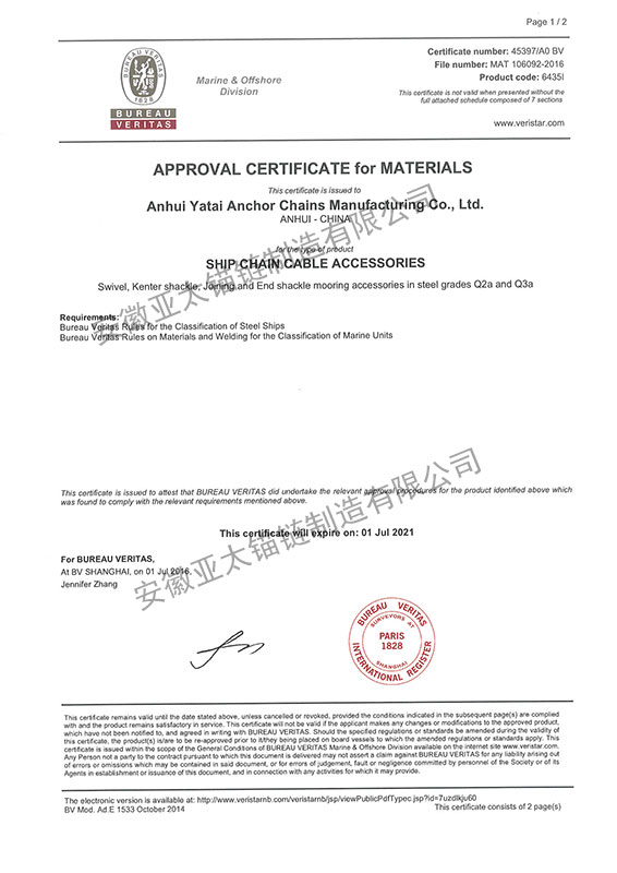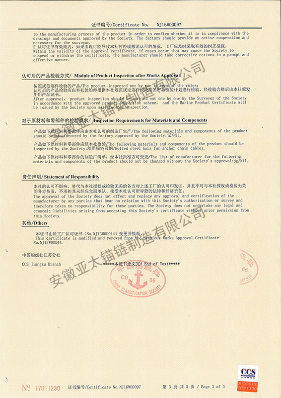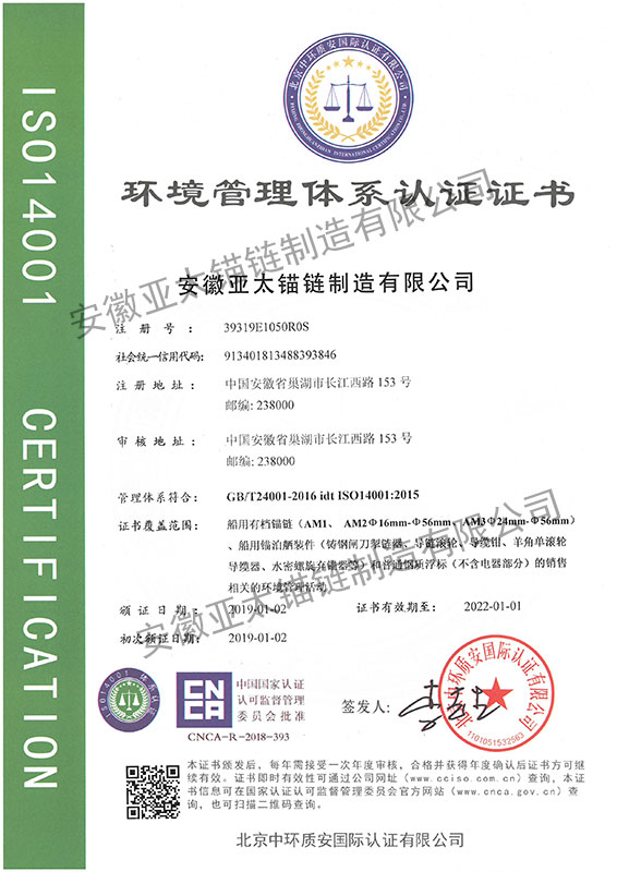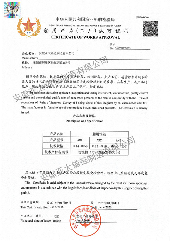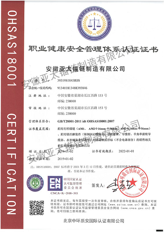 安徽亞太錨鏈制造有限公司是國家高新技術(shù)企業(yè),也是國家GB/T 549-2017《電焊錨鏈》標準的起草和制定單位之一。公司旗下設有錨鏈分廠、浮標分廠、舾裝件分廠等多個分廠。公司專業(yè)從事φ12.5mm-φ107mm二、三級船用錨鏈、浮標錨鏈、錨鏈附件,錨、船舶曬裝產(chǎn)品、航標、系船浮、船型標、多種規(guī)格海洋監(jiān)測浮標及航標燈等產(chǎn)品的生產(chǎn)、安裝和服務。目前公司的產(chǎn)品銷往全國各地船廠、碼頭、航標處、航道局、海洋局,并已走上國際市場,如東南亞、中東、歐美等國家。
